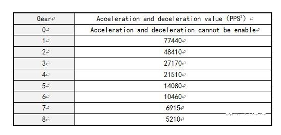 如下圖圖示,42mm兩相混合式步進(jìn)電機(jī)系列系統(tǒng)總線中小型步進(jìn)電機(jī)控制器的加加減速機(jī)時(shí)間分八個(gè)級(jí)別,各自相匹配1-8的加降速指數(shù),標(biāo)值越倍加減速時(shí)間越長