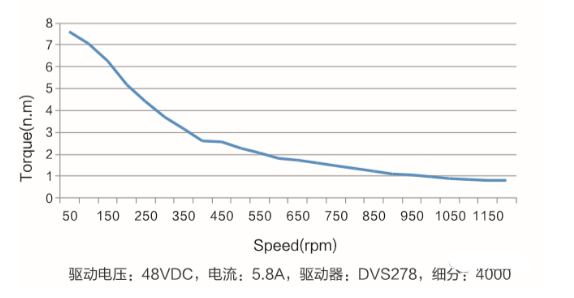 步進電機和伺服電機不同,他的力矩輸出不是恒定的,隨著轉(zhuǎn)速的升高力矩會下降,所以步進沒有額定力矩的說法,只有靜力矩參數(shù),就是電機激磁,速度接近0時的力矩就是步進電機的最大力矩。所以步進電機的選型不得不考慮他的力矩速度特性曲線,下圖是米格兩項8牛米步進電機的力矩速度特性曲線圖。